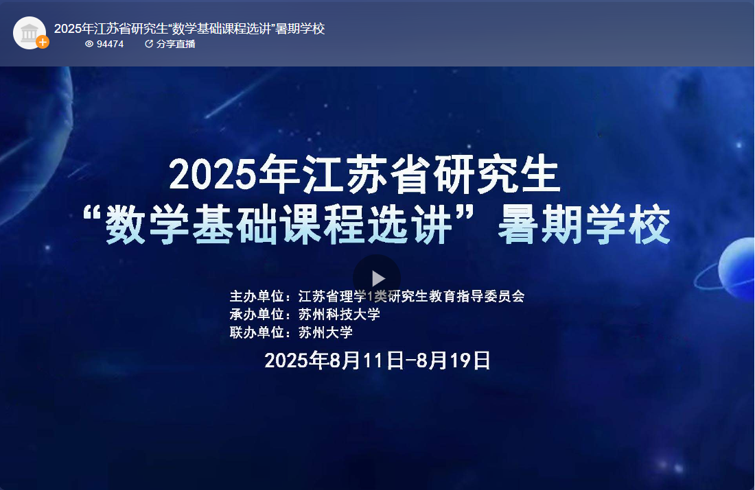 2025年8月11日至24日,由江苏省理学1类研究生教育指导委员会主办、英国365集团承办、苏州大学英国365集团联办的“2025年江苏省研究生数学基础课程选讲暑期学校”成功举行。