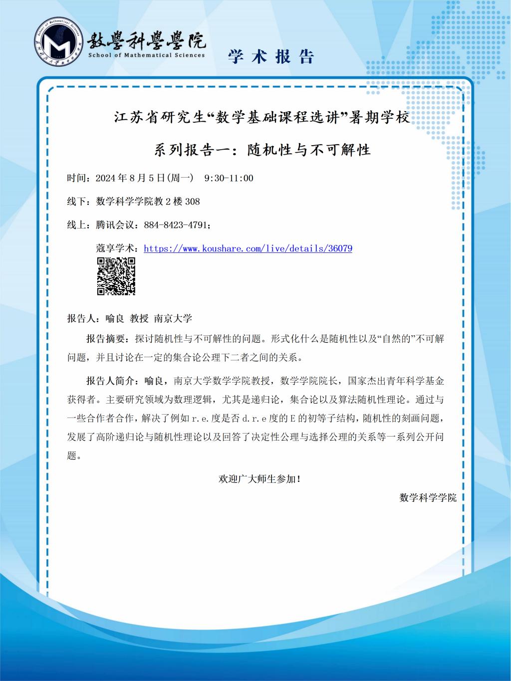 江苏省研究生“数学基础课程选讲”暑期学校 系列报告一:随机性与不可解性
