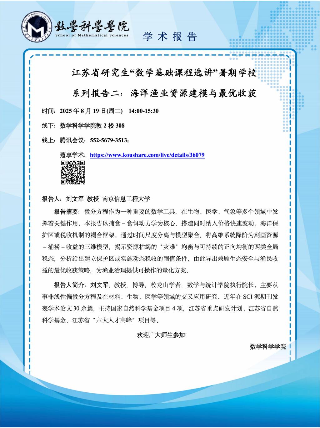江苏省研究生“数学基础课程选讲”暑期学校 系列报告二:海洋渔业资源建模与最优收获